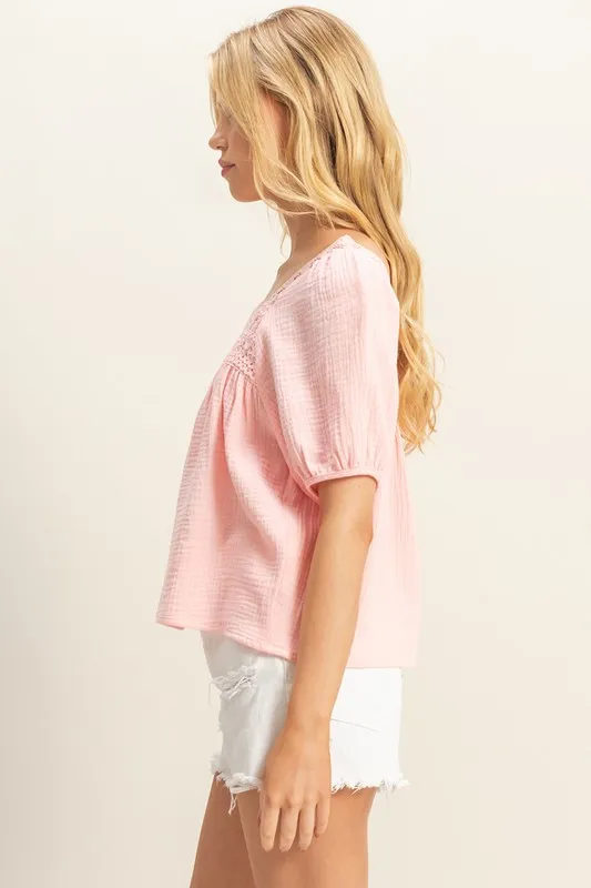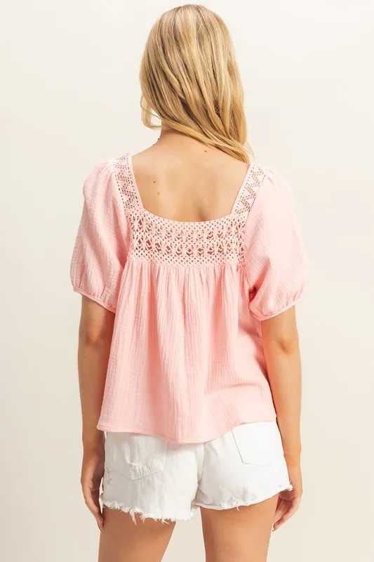 Crochet Detail Puff Sleeve Peasant Top – Baby Pink